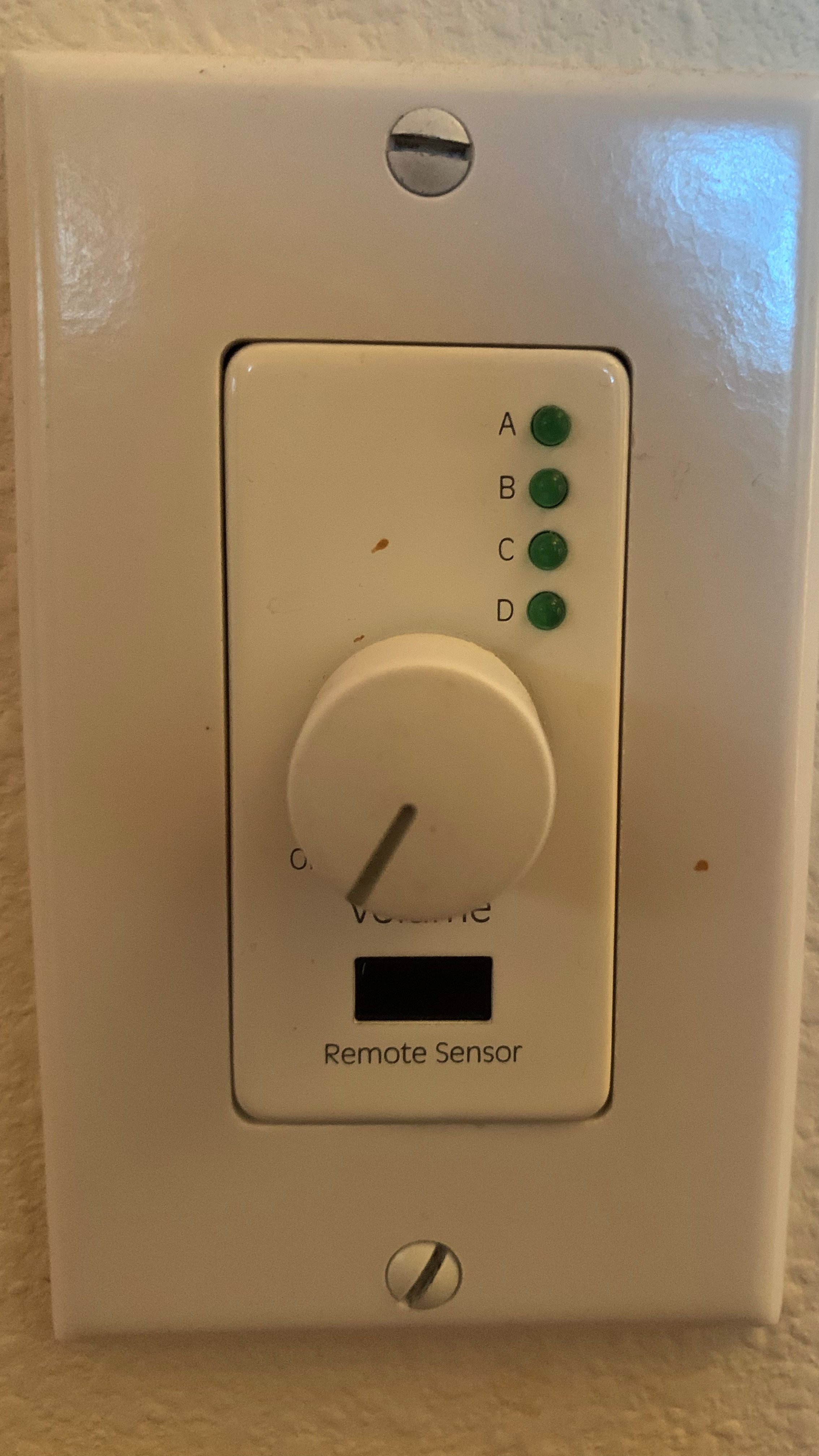 Turn the volume dial clockwise and the green light next to A should come on. If a different letter lights up, press the volume dial in until A is illuminated. The leftmost control in the living room controls speakers in the backyard.