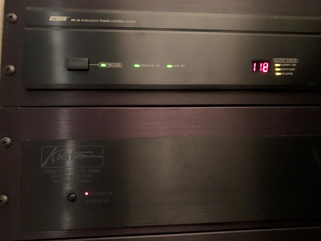 If the light doesn’t come on, the power supply down in the theater room may have timed out. The “Power on” light on the “Kustom” amplifier in the theater room needs to be on. In this picture, you can see it’s turned off: