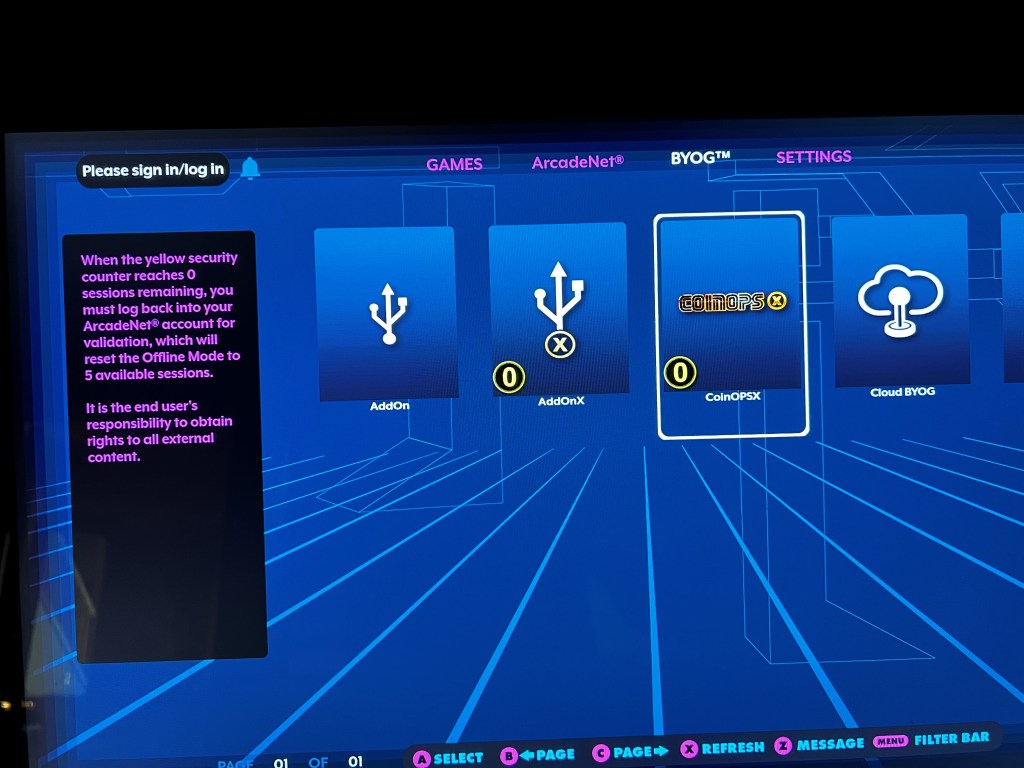 Now use the joystick to navigate to the BYOG section listed at the top of the screen. From there, use the joystick to highlight “CoinopsX” and press the A button. This will take you to a list of the games on that thumb drive. To leave this section you can press the “Rewind” button.