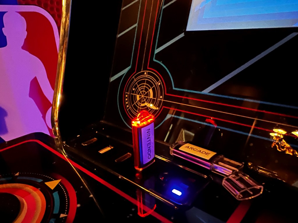 There are additional games available on thumb drives (with labels like “Arcade” and “Nintendo”). Most popular games you might think of that didn’t come with the cabinet are on these thumb drives (e.g. Pac-Man is on the “Arcade” thumb drive, Super Mario Bros is on the “Nintendo” thumb drive). To use one of these thumb drives, take off the cap and insert it into one of the USB slots on the left side of the control panel.